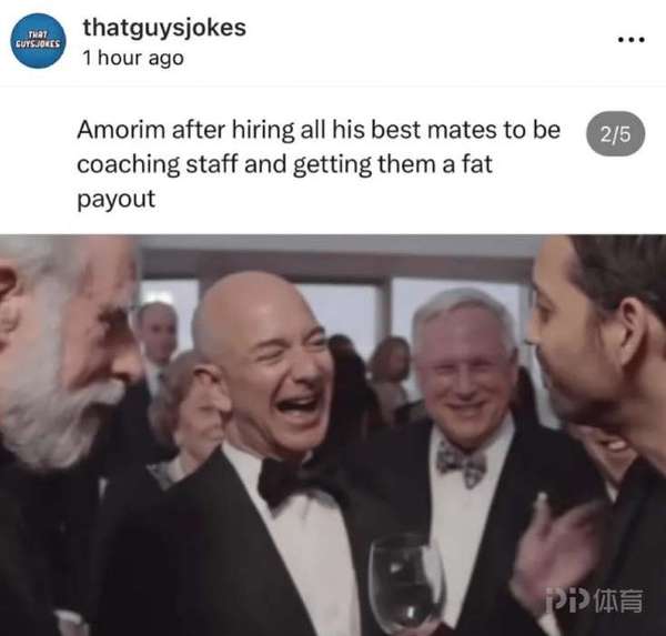 网红段子手thatguysjokes的一条推文,意外扯出了曼联更衣室的微妙反应。那张被疯传的梗图里,阿莫林被P成黑帮大佬模样,配文调侃他把亲信安插进教练组"吃空饷"——结果被解雇时,兄弟们还能跟着领笔丰厚遣散费。